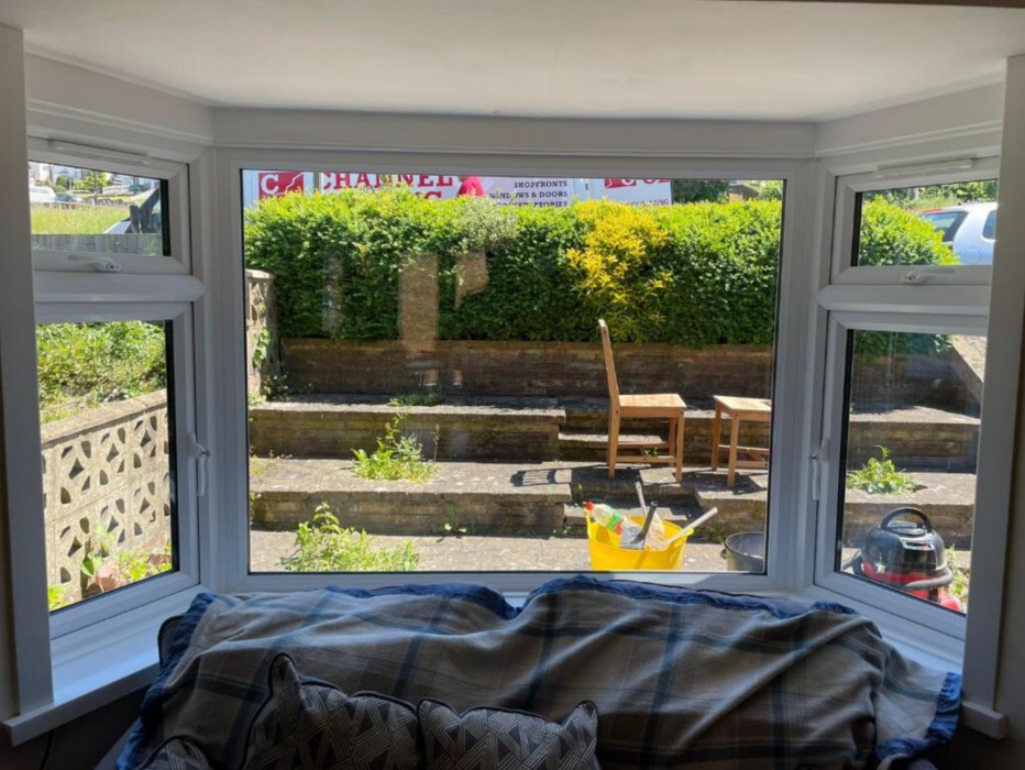 BEAUTIFUL W HITE UPVC PLASTIC BAY WINDOWS PLUS A NEW BATHROOM WINDOW FITTED BY CHANNEL GLAZINGS EXPERT FITTERS ALL ENQUIRES PLEASE CONTACT GARY ON 01273380022